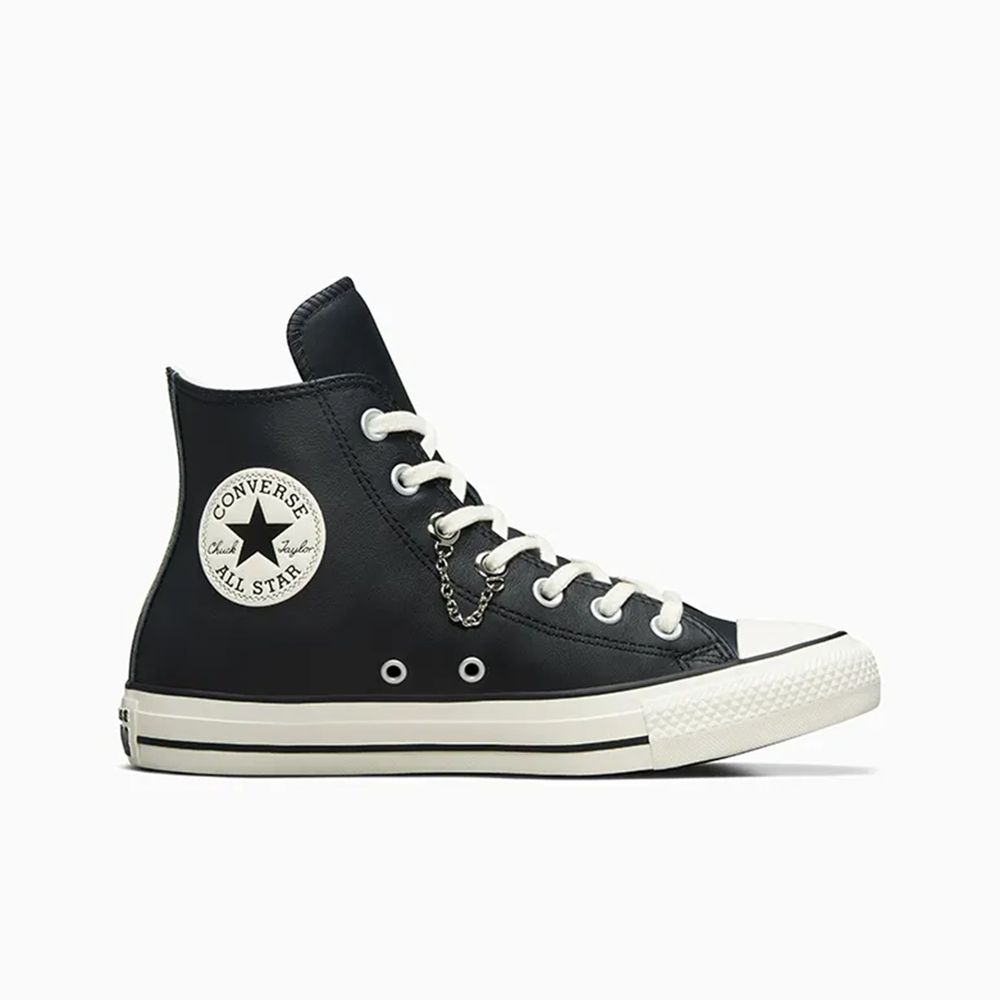 Zapatillas Converse de cuero para mujer, que combinan el clásico diseño Chuck Taylor con un toque moderno y atrevido. Confeccionadas en cuero premium, ofrecen durabilidad y estilo. Los detalles de cadenas en los ojales añaden un elemento distintivo y sofisticado, perfecto para quienes buscan destacar. Ideales para crear looks urbanos con personalidad.