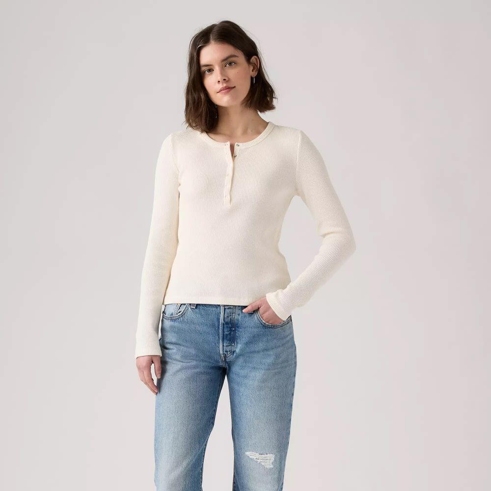 Esta camiseta Waffle Henley combina estilo retro y comodidad moderna: cuenta con cuello de pico, tapeta de tres botones, fit estrecho y cropped, y está confeccionada en tejido de punto waffle suave y texturizado.