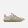 Zapatilla deportiva Bowie Mustang para mujer, inspirada en la clásica bamba blanca, destaca por sus deslumbrantes colores planos con glitter en negro. La trasera es de un suave rosa pastel y presenta un original diseño con brillantes plateados en el lateral. Su suela de goma es cómoda y ligera, convirtiéndolas en el toque extra de estilo que tus looks deportivos necesitan.