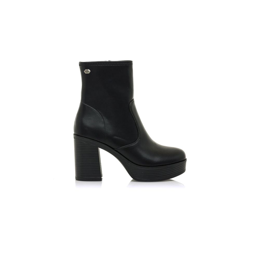 Botín New 67 de tacón Mustang en negro. Estilo casual con puntera redondeada y piso con plataforma y tacón grueso. Su caña es estrecha y tiene cierre de cremallera en la parte interior de la caña. Un básico de colección que no puede faltar este invierno en tu armario.