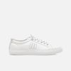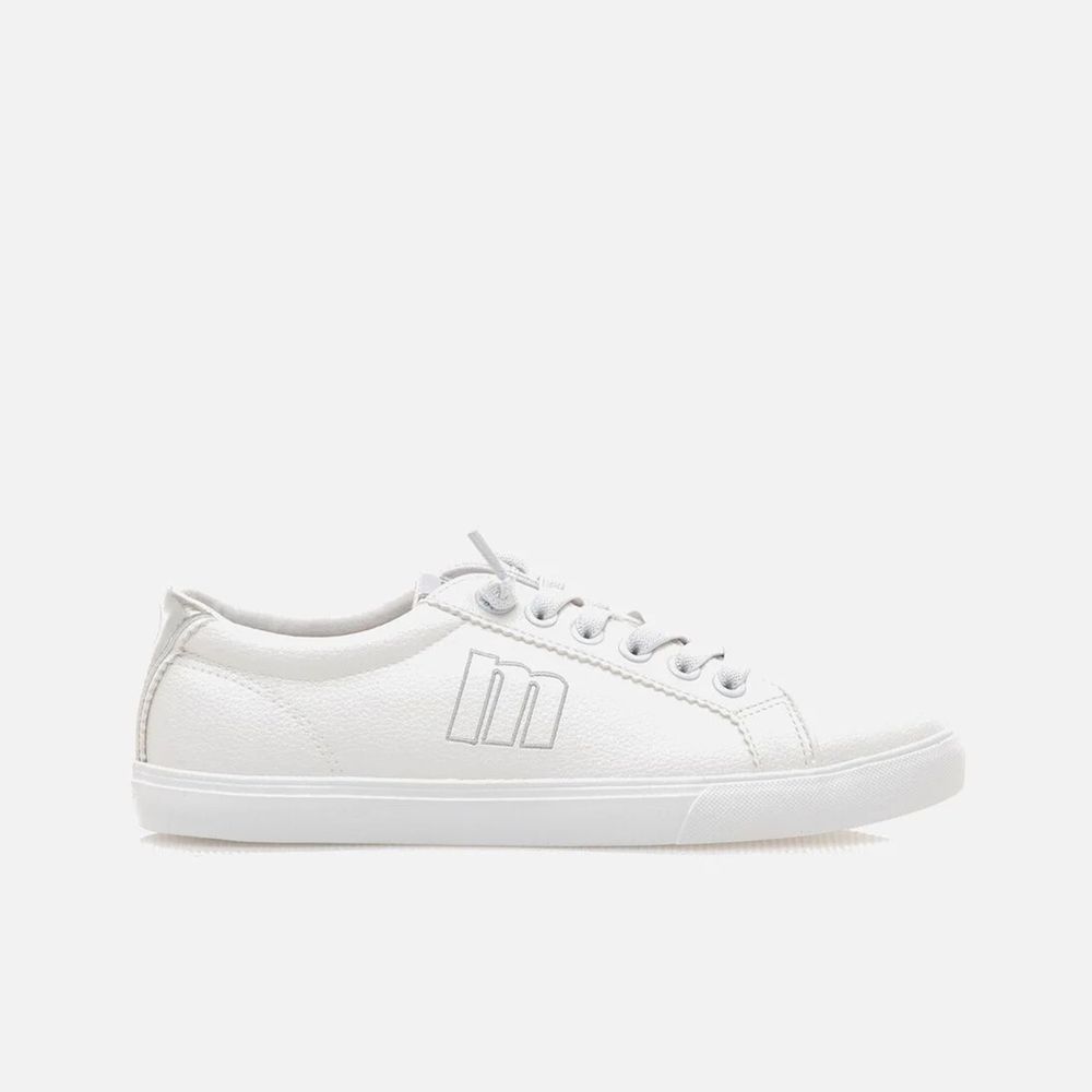 Zapatilla blanca Aria de mujer de la marca Mustang. Cuentan con la M del logo en el lateral. Su suela es plana, sus cordones blancos, y la parte del talón hace que la deportiva destaque por su color plata metalizado. Perfectas para un look casual y femenino con un toque de color.