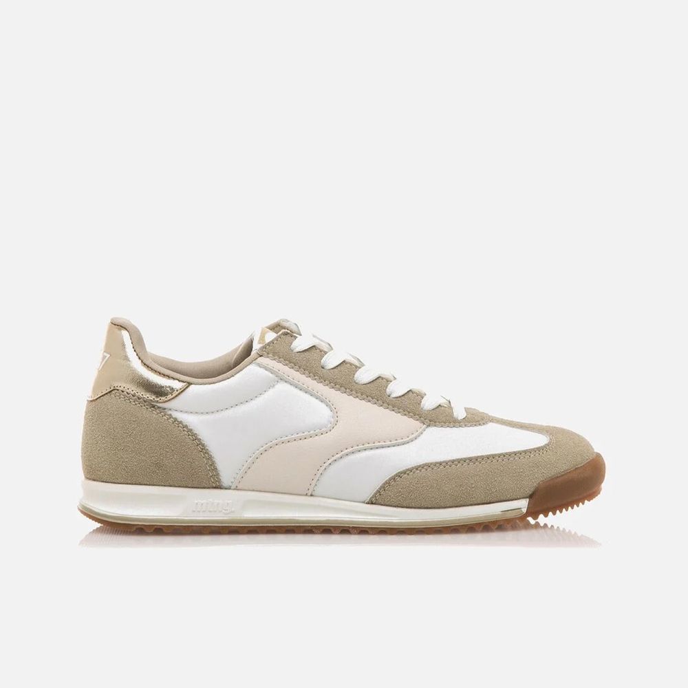 Zapatillas marrón arena Olympic de mujer de la marca Mustang. Estas zapatillas combinan comodidad y estilo. Su contraste de colores beige y blanco junto con el toque dorado en el talón, aporta un look moderno y elegante.