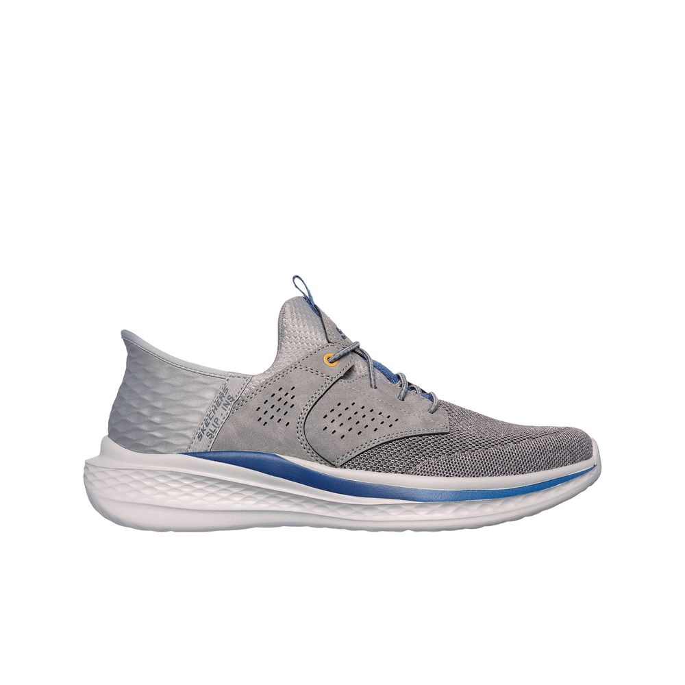 Camina con total comodidad con la Skechers Slip-ins® Relaxed Fit™: Slade - Caster. Diseñada con el sistema Heel Pillow™, este modelo con cordones elásticos presenta una parte superior de malla y material sintético. Incorpora una plantilla Skechers Air-Cooled Memory Foam™ con infusión de carbón, que ayuda a mantener la frescura, junto con el soporte para el arco Skechers Goga Mat Arch™, ofreciendo una pisada cómoda y estable durante todo el día.
