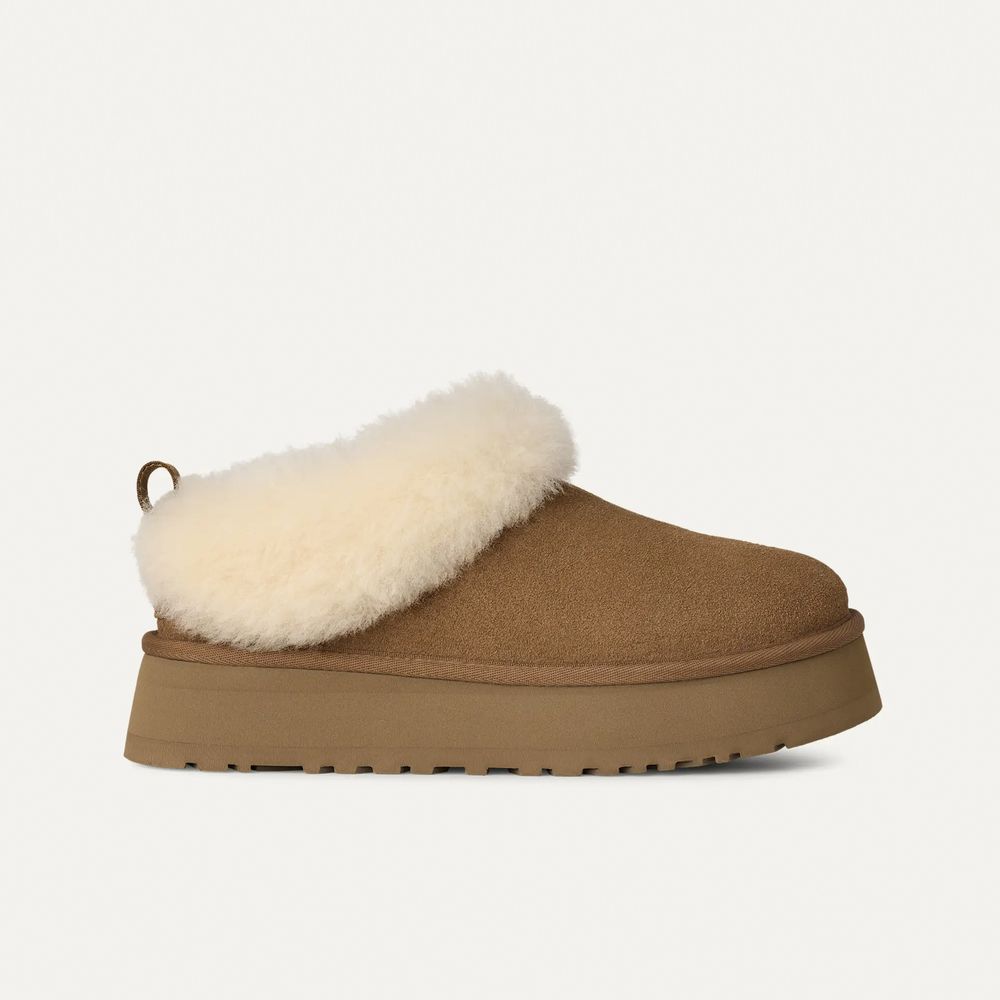 Las UGG Tazzelle están hechas para ti. Estas zapatillas ultramullidas, aptas tanto para interior como para exterior, combinan ante auténtico con una ligera plataforma de 4,4 cm fabricada en EVA derivada de caña de azúcar, elástica y ligera. El interior está forrado en suave piel de oveja, que también recubre el lujoso puño fijo, para que las disfrutes con calcetines… o sin ellos.