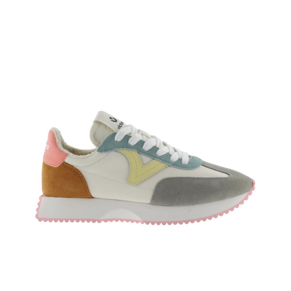 Zapatillas retro para mujer confeccionadas en nailon y detalles superpuestos en serraje. Diseñadas para brindar una experiencia ultraligera, destacan por sus detalles flúor en la suela y la parte trasera. Presentan un distintivo V retro en el lateral, en armonía con la etiqueta de la lengüeta, y se cierran mediante cordones blancos. La suela de E.V.A. no solo proporciona una pisada cómoda, sino que, junto al patín dentado, asegura un agarre firme en cada paso.
